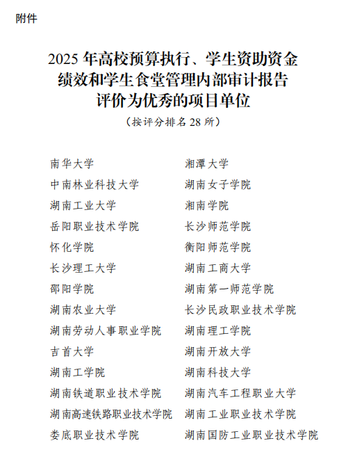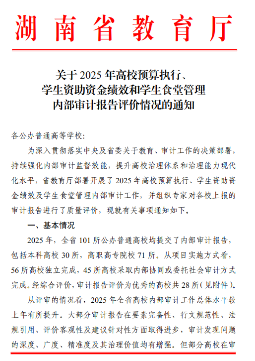 近期,湖南省教育厅下发《关于2025年高校预算执行、学生资助资金绩效和学生食堂管理内部审计报告评价情况的通知》,我校自主独立审计、报送的《湖南理工学院2024年度预算执行、学生资助资金绩效和学生食堂管理审计报告》获评优秀,全省101所公办普通高校中,有56所高校独立完成,45所高校采取内部协同或委托社会审计方式完成。
